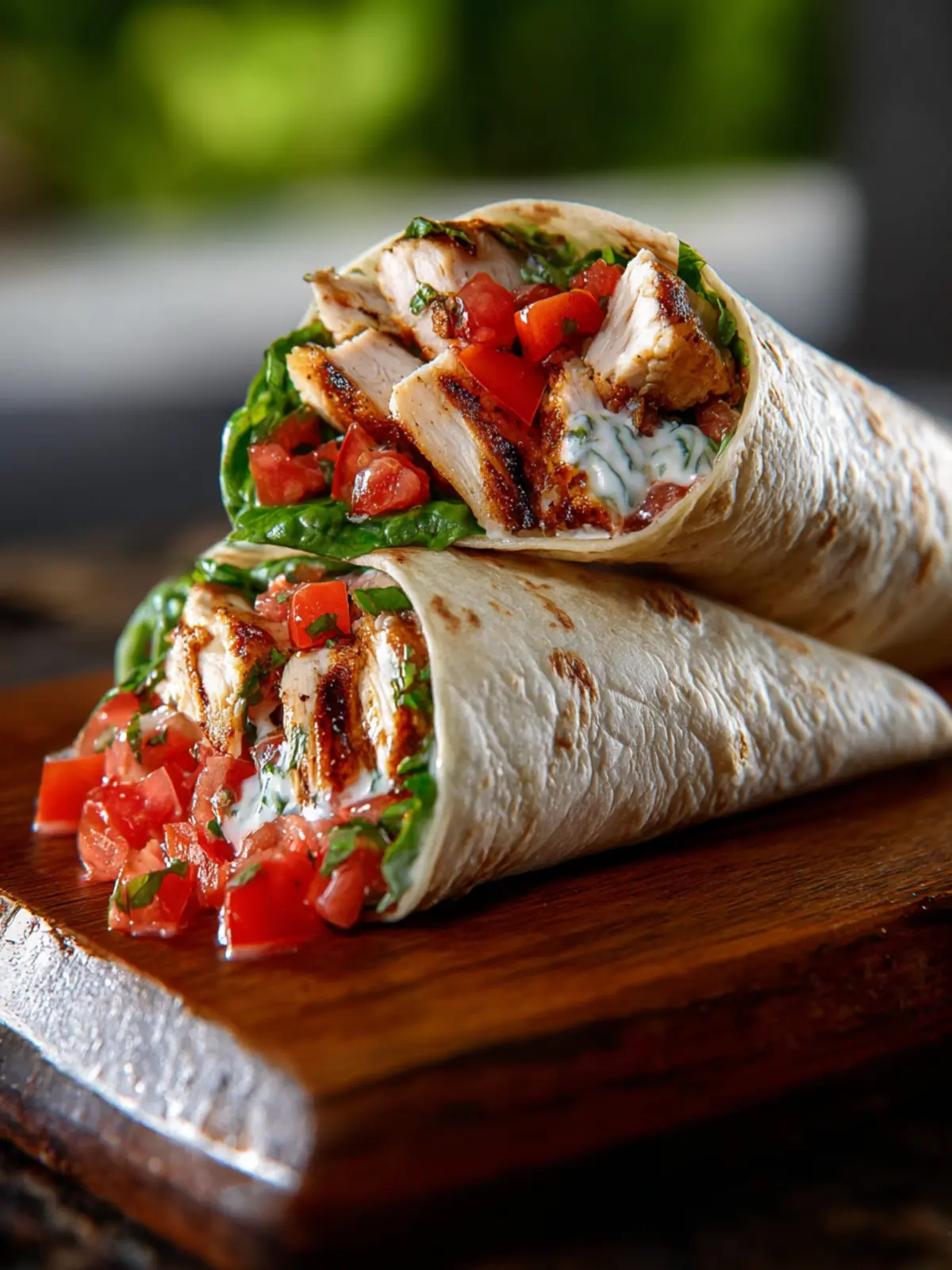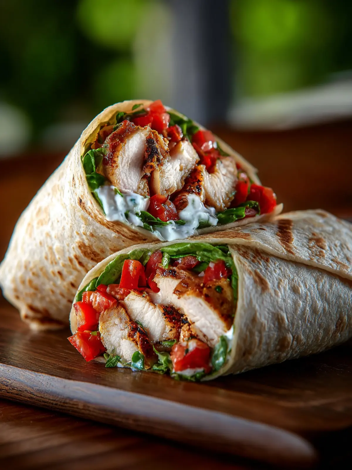 A delicious and healthy wrap featuring bruschetta chicken, fresh vegetables, and a creamy yogurt spread.
