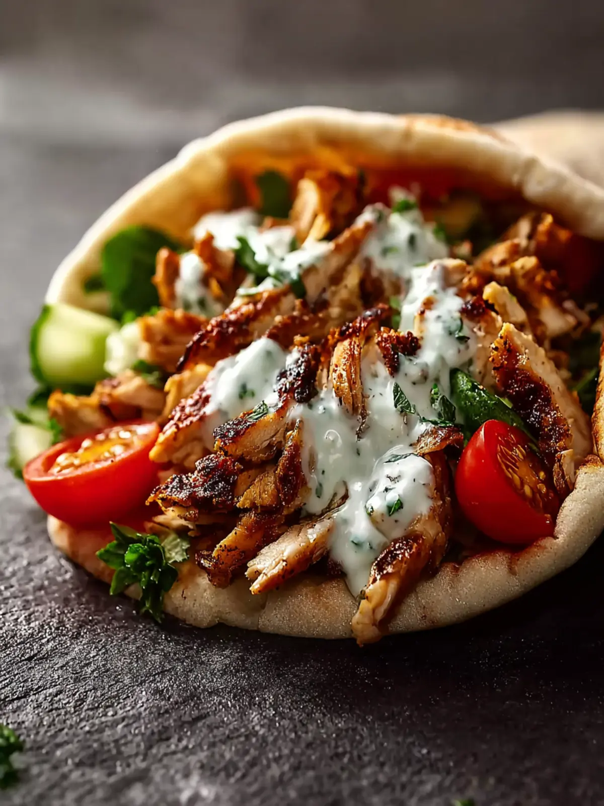 9. Warm pita bread briefly. Spread generous amount of garlic sauce on bread. Layer with chicken, vegetables, and additional garlic sauce. Serve immediately.