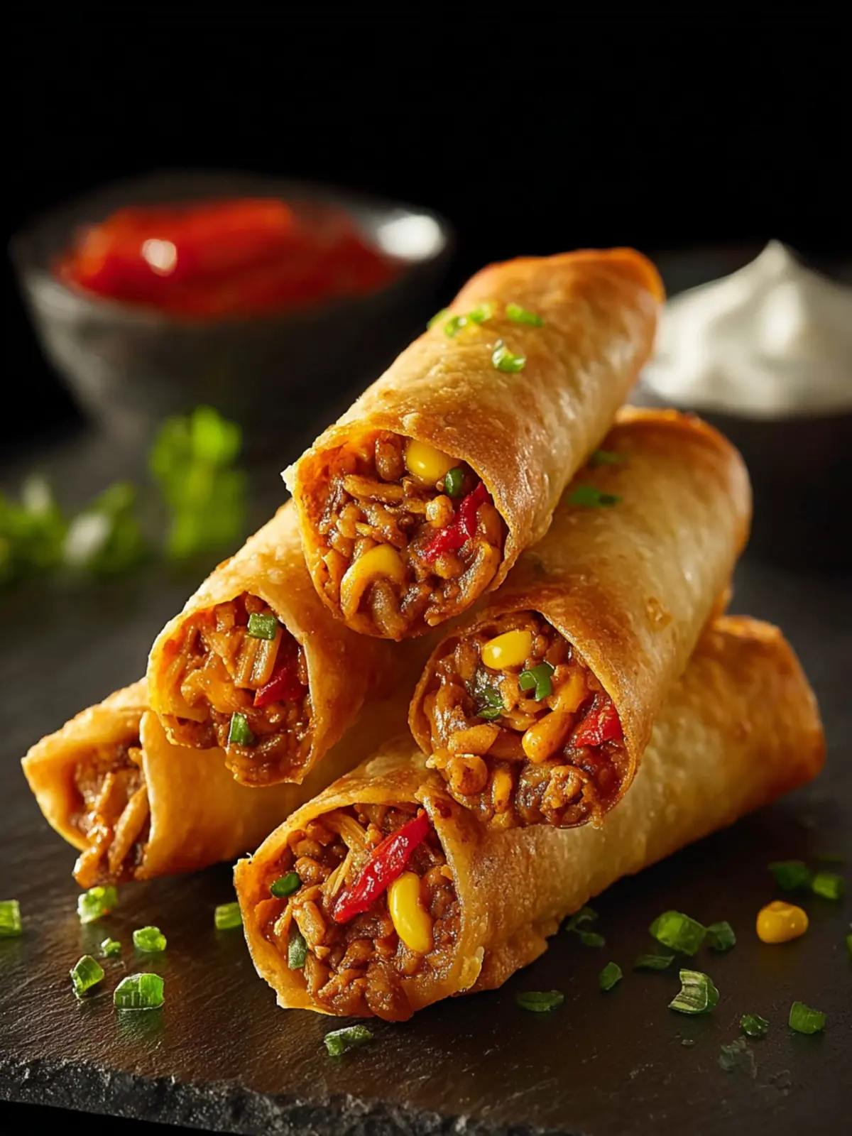A Tex-Mex Blitz: Each eggroll is packed with tender chicken, black beans, corn, and spinach, all wielding their distinct flavors to create a fiesta in your mouth. Did you know that black beans are a great source of protein and fiber? You’ll feel fuller and more satisfied after enjoying them.