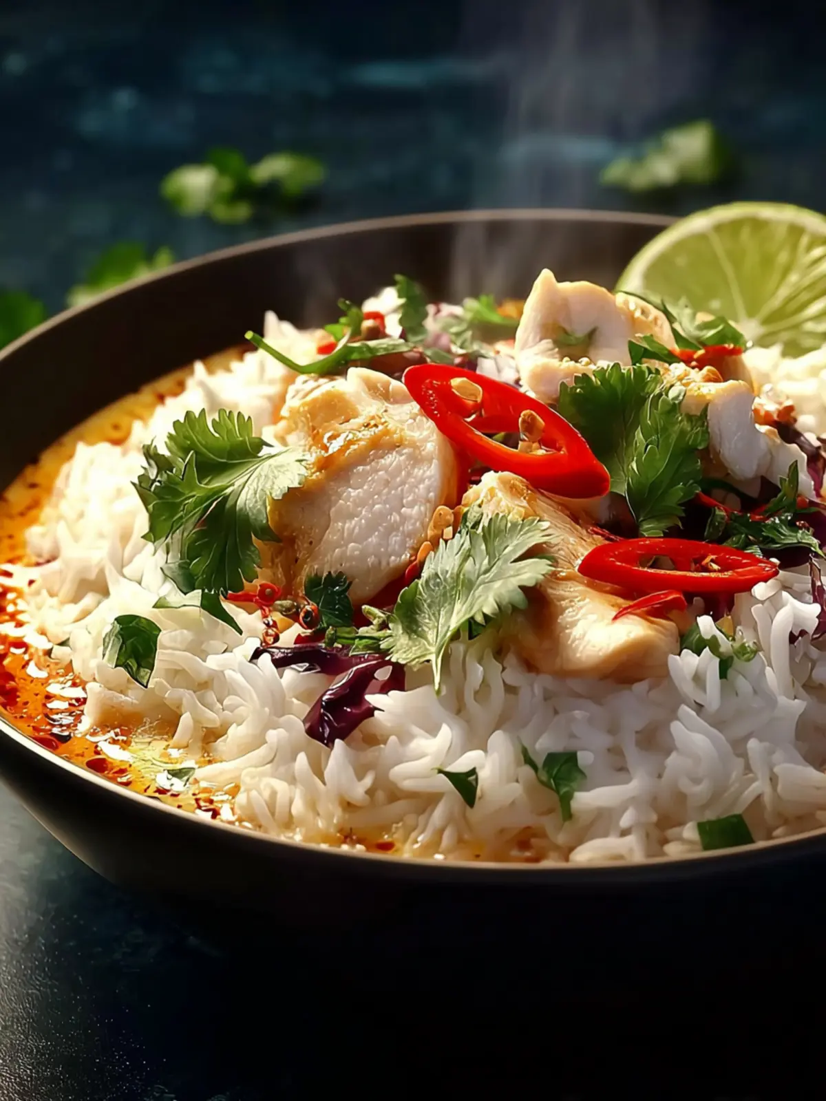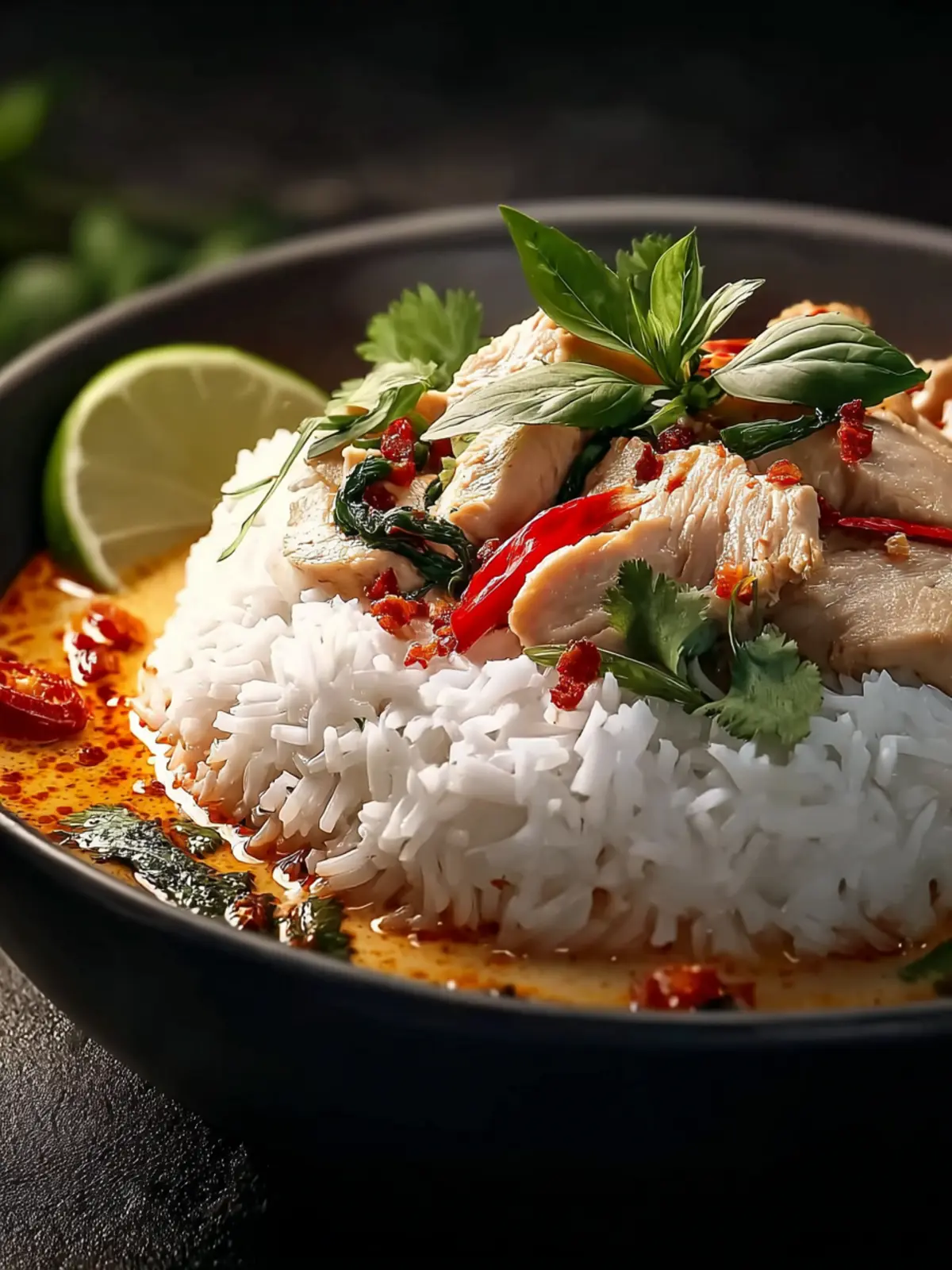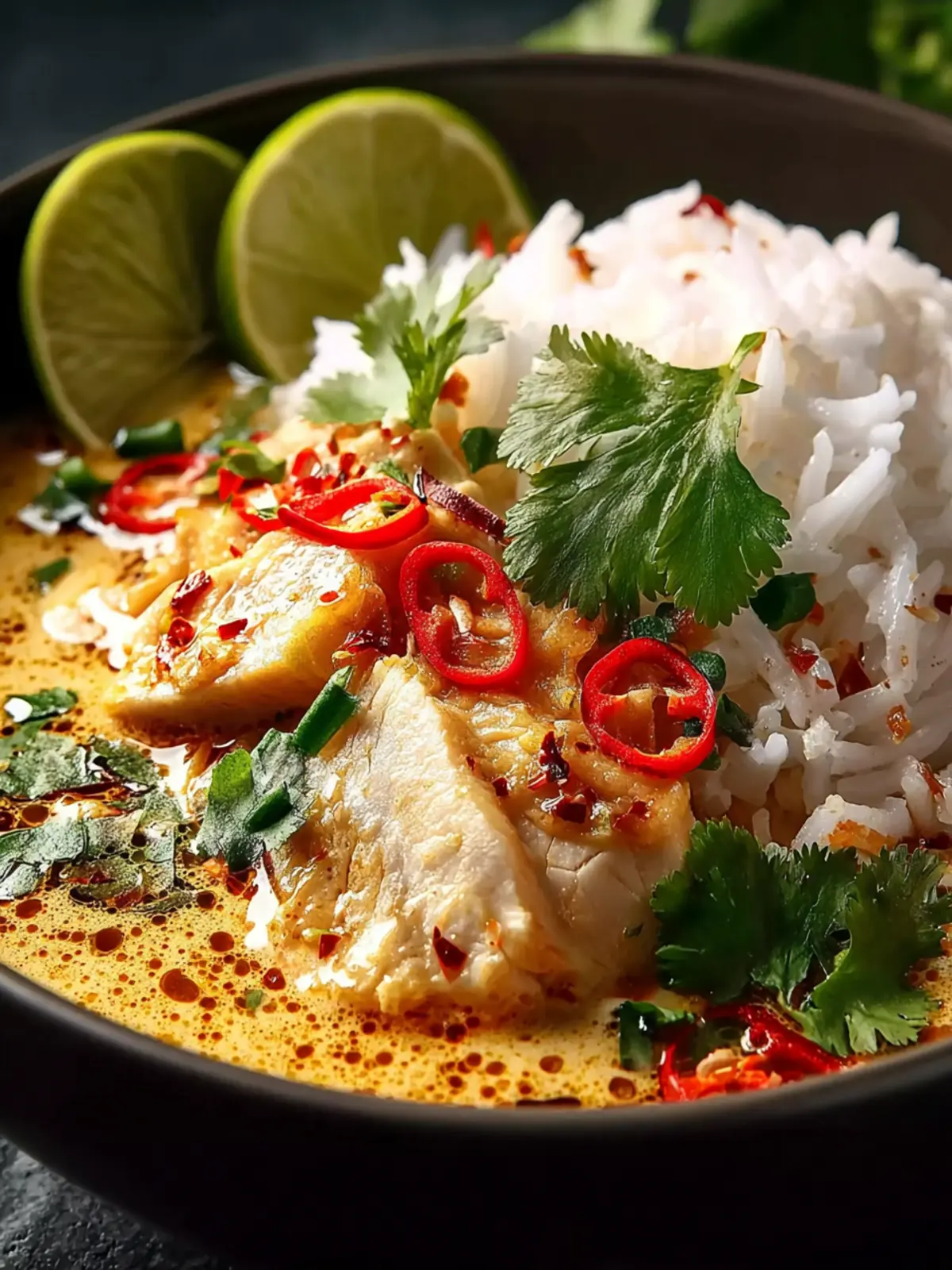 A flavorful coconut curry chicken served with jasmine rice, topped with fresh herbs and lime.