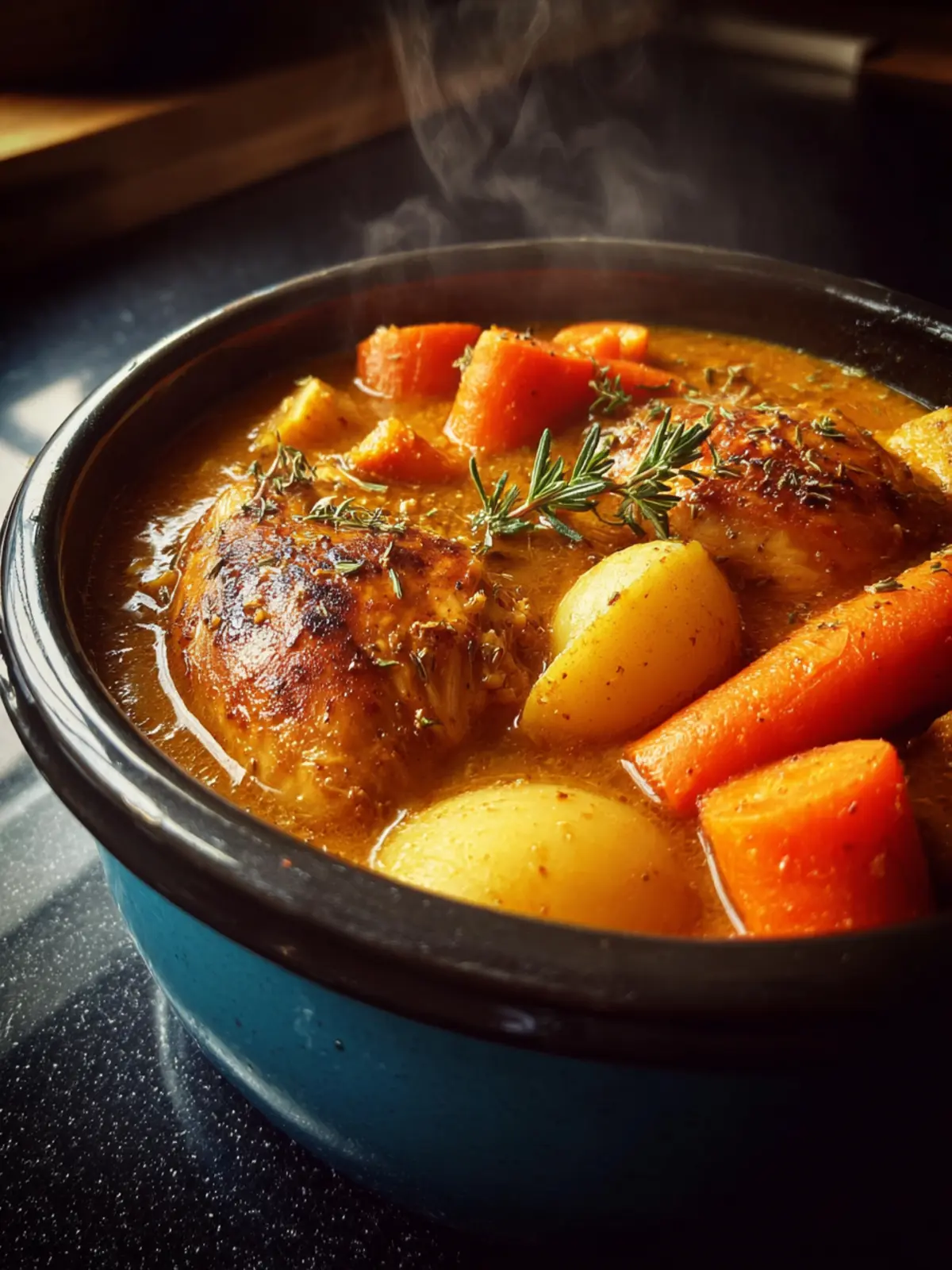 A delicious and easy recipe for crockpot chicken thighs with vegetables and herbs.
