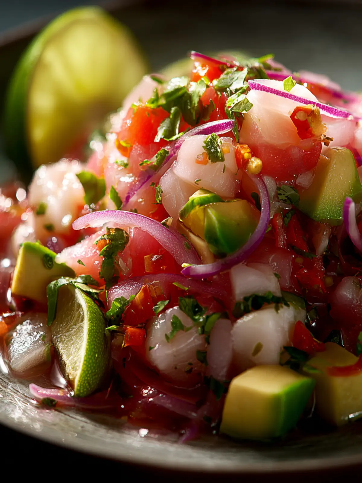 Enjoy this fresh and zesty ceviche made with sushi-grade fish, lime juice, and vibrant vegetables, perfect for a refreshing appetizer.