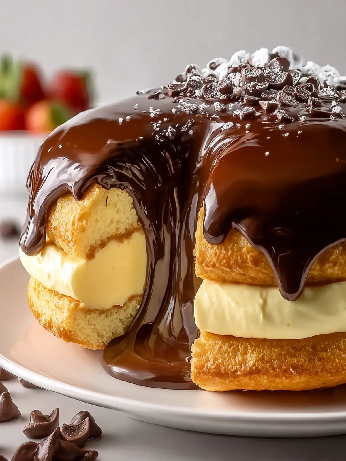A delicious chocolate cake layered with creamy custard and topped with a rich chocolate glaze.