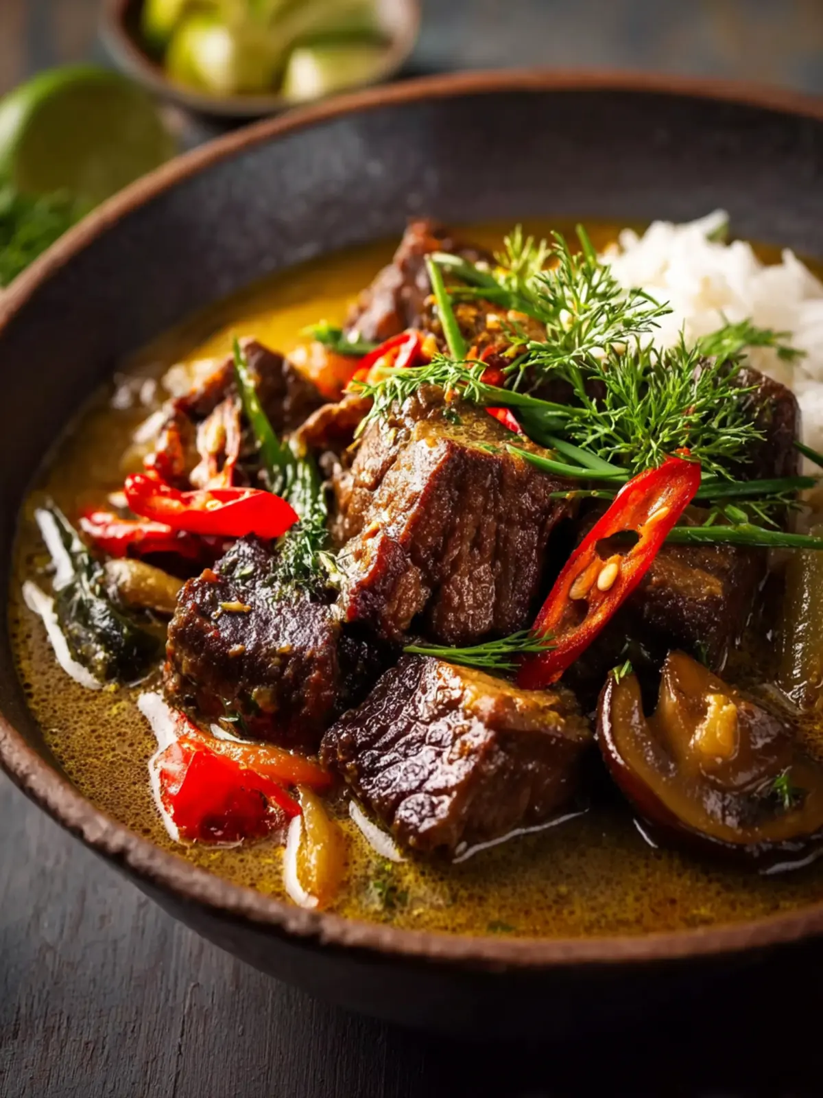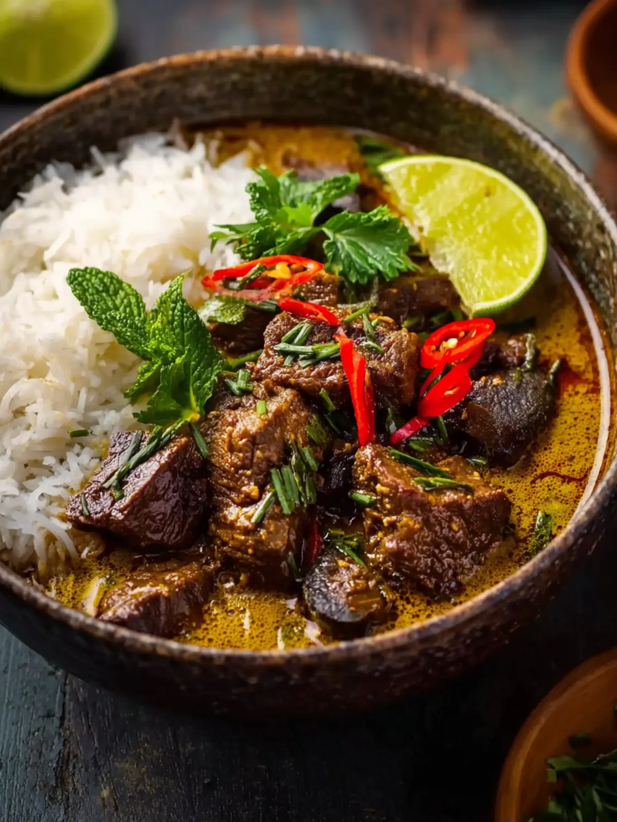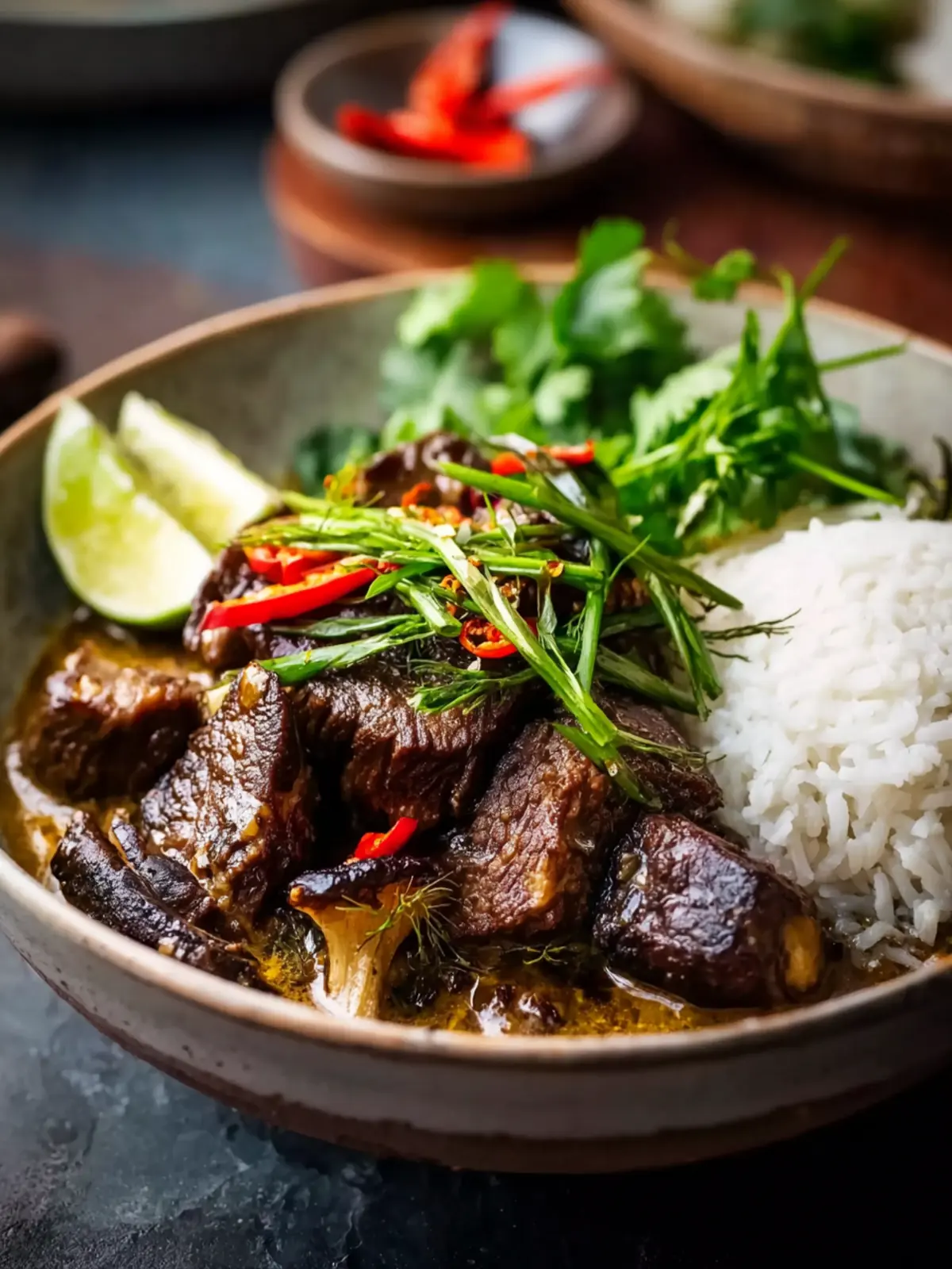 A rich and flavorful braised beef dish with lemongrass and coconut milk, perfect for a comforting meal.