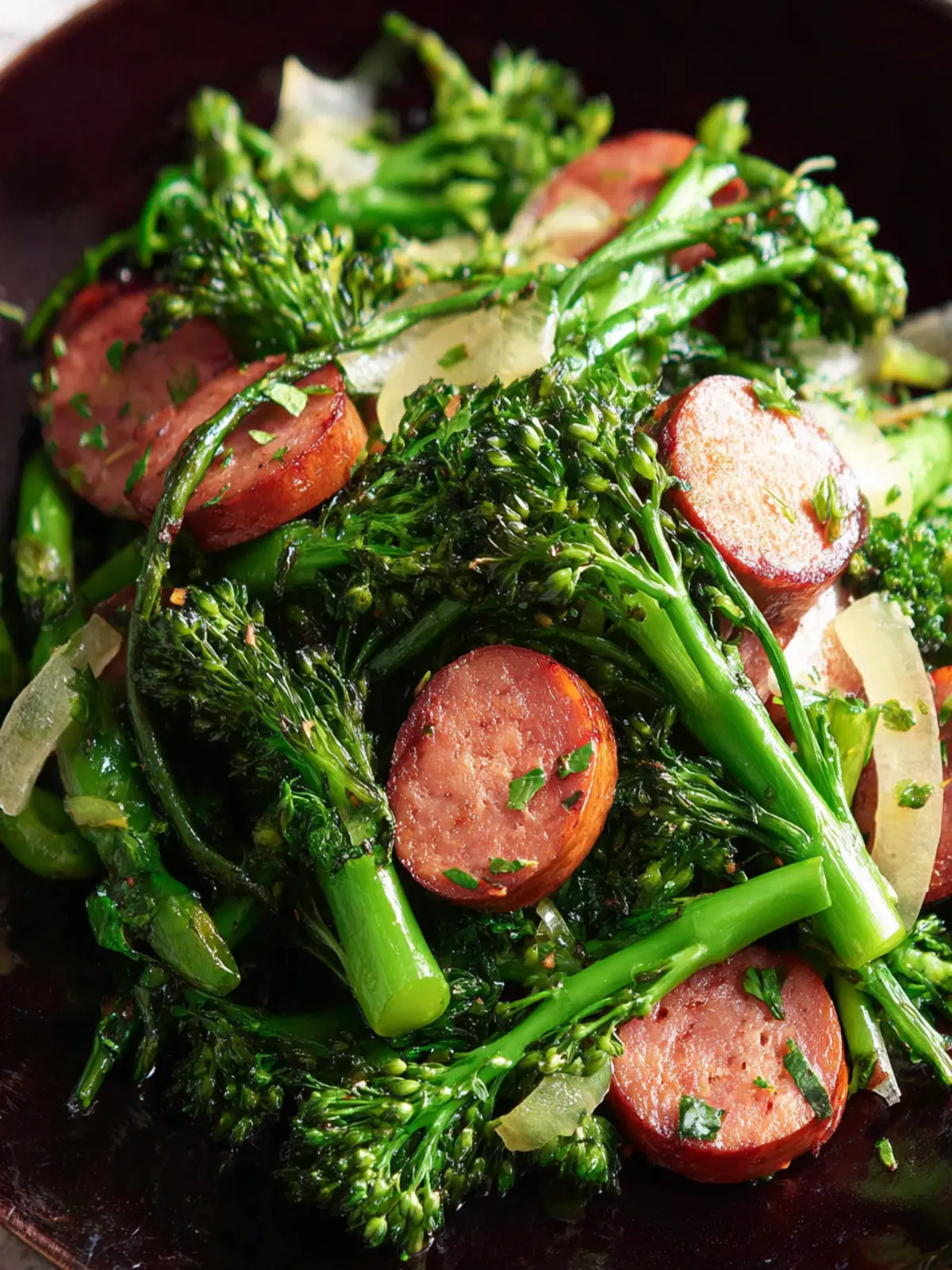 A delicious and quick sautéed broccolini dish with smoked sausage.