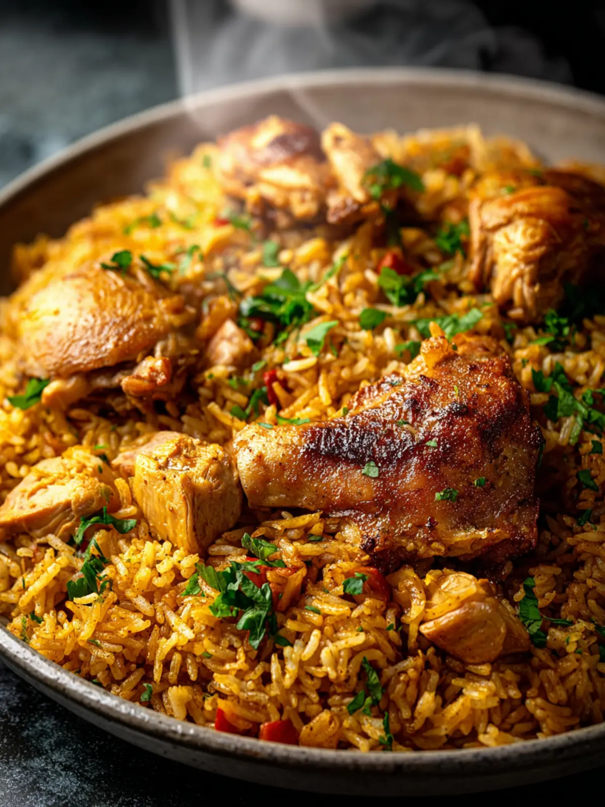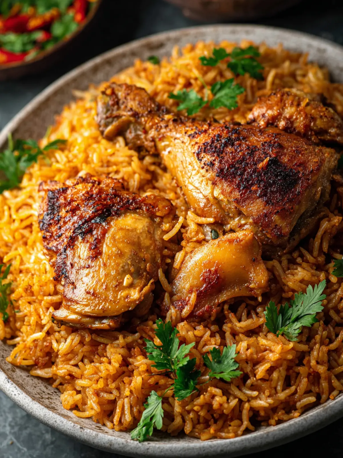 Accompaniments: Serve it alongside a fresh salad made of chopped cucumbers, tomatoes, and parsley, dressed with lemon juice and olive oil. This refreshing side complements the richness of the rice and chicken perfectly.
